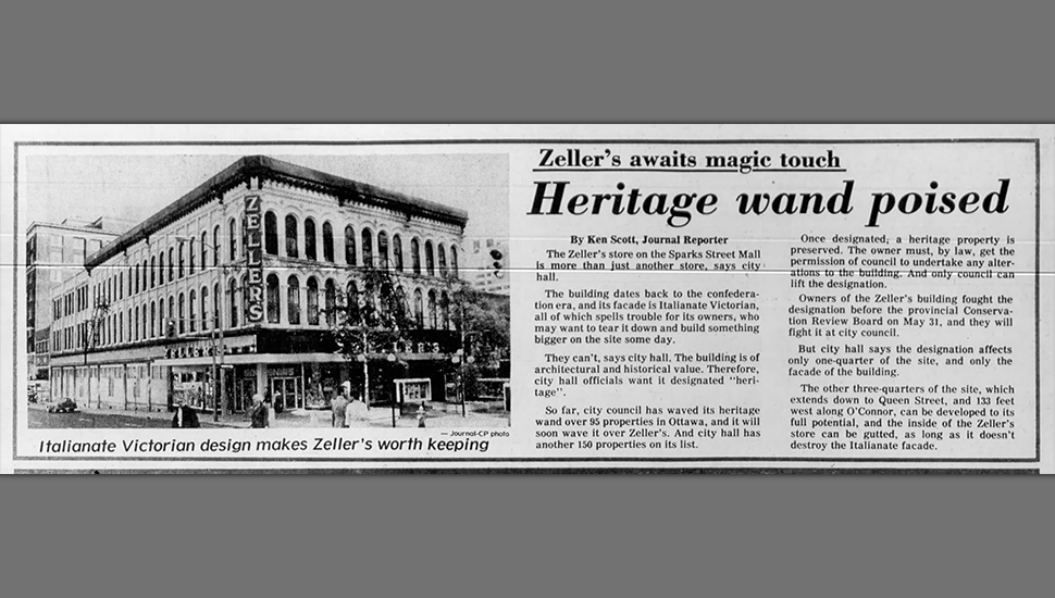 Mais tout n’était pas perdu. À l’automne 1983, la Compagnie de la Baie d’Hudson présente un projet révisé conservant l’immeuble. Le conseil municipal l’approuve en mars 1984, permettant la construction d’une tour de 14 étages face à la rue Queen – en retrait pour minimiser la projection d’ombre sur le mail de la rue Sparks – et la restauration de l’immeuble Zellers.
