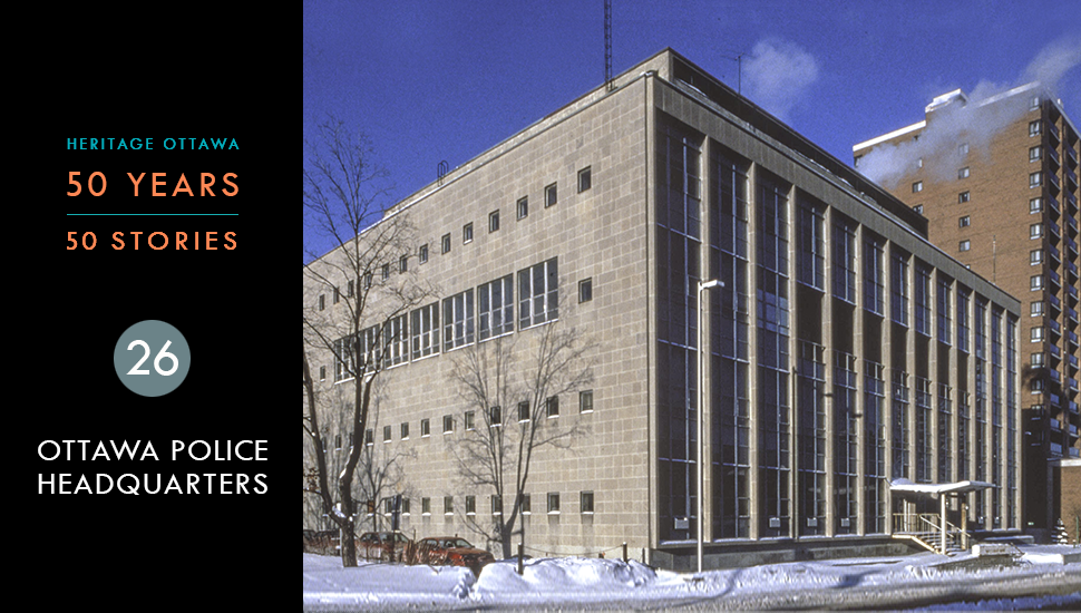 Le quartier général de la Police d’Ottawa sur la rue Waller avait été construit sur mesure, pour remplacer l’immeuble érigé en 1888-1889 sur la rue Queen. La commande avait été passée à Peter Dickinson (1925-1961), du cabinet d’architectes torontois Page and Steele, à l’issue d’un concours national ayant regroupé 37 participants.