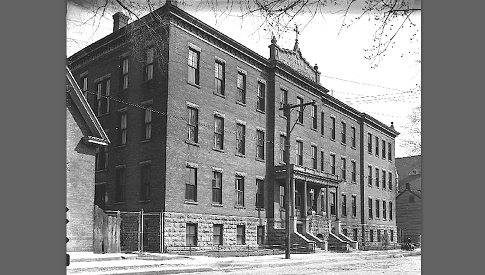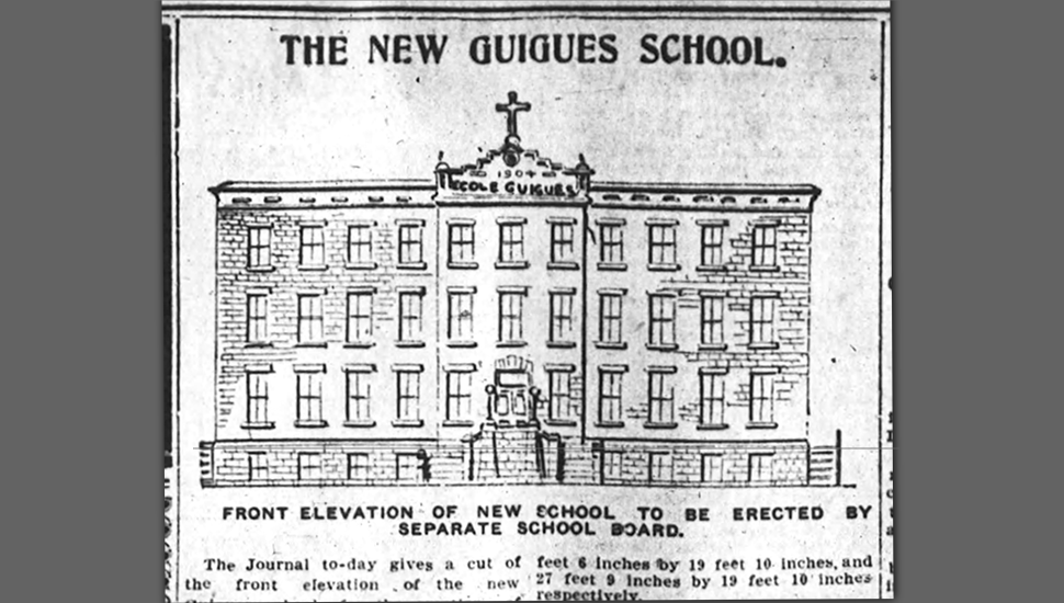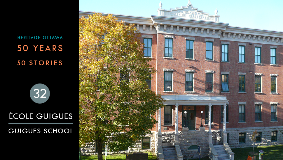 L’école Guigues a été nommée en l’honneur de Mgr Joseph-Eugène-Bruno Guigues, premier évêque catholique d’Ottawa. Construite en 1904 pour accueillir 100 garçons, elle remplaçait une précédente école francophone à proximité. L’immeuble néoclassique est l’œuvre de l’architecte d’Ottawa Félix Maral Hamel (1851-1907). Il comportait 14 classes, le logement pour 15 frères des Écoles chrétiennes et une chapelle.