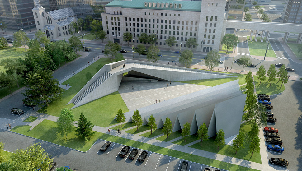 Sans consultation, le gouvernement fédéral décide en 2013 de construire le monument à grande échelle sur le site longtemps réservé pour un palais de justice fédéral pour compléter la triade.
